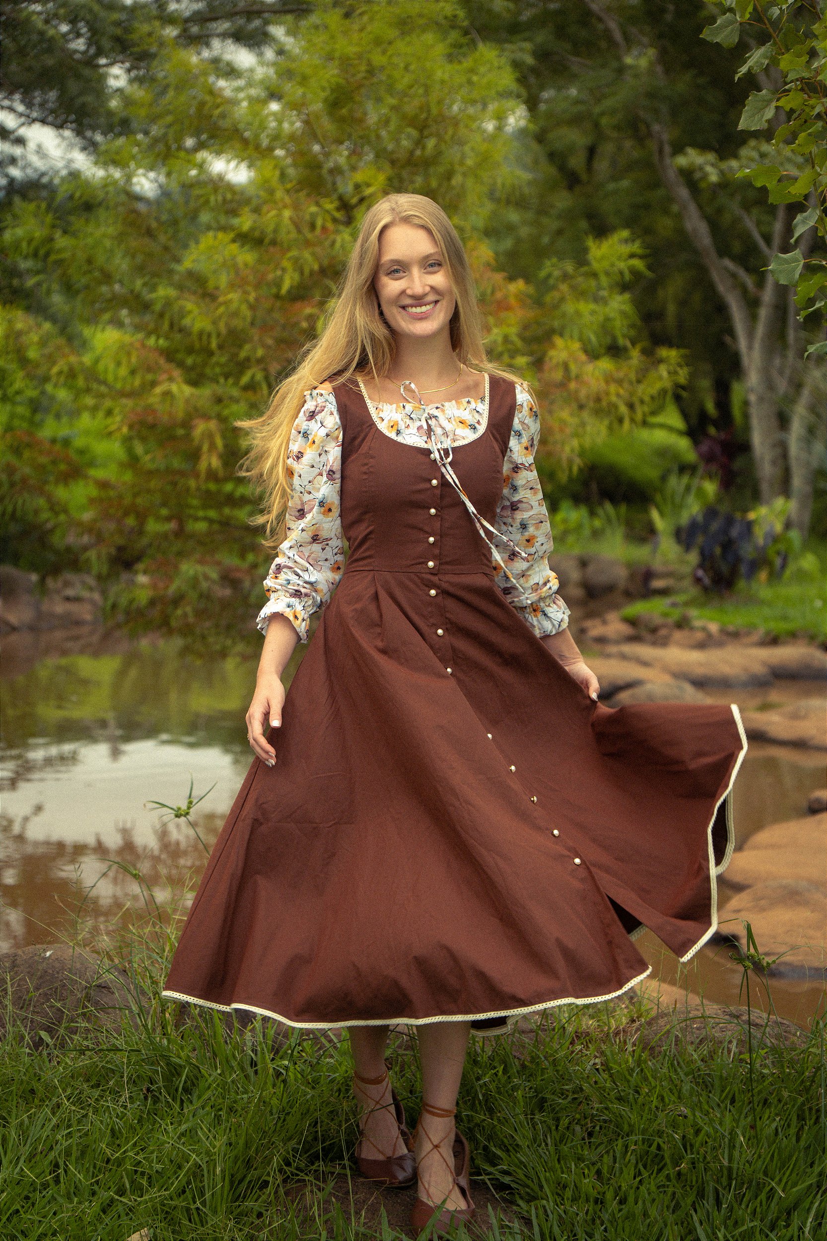 O comprimento da saia é midi e possui bolsos embutidos nas laterais para torná-lo ainda mais prático no dia a dia. As versões rendadas possuem aplicação em todo decote e barra da saia, dando ainda mais o ar cottage à peça